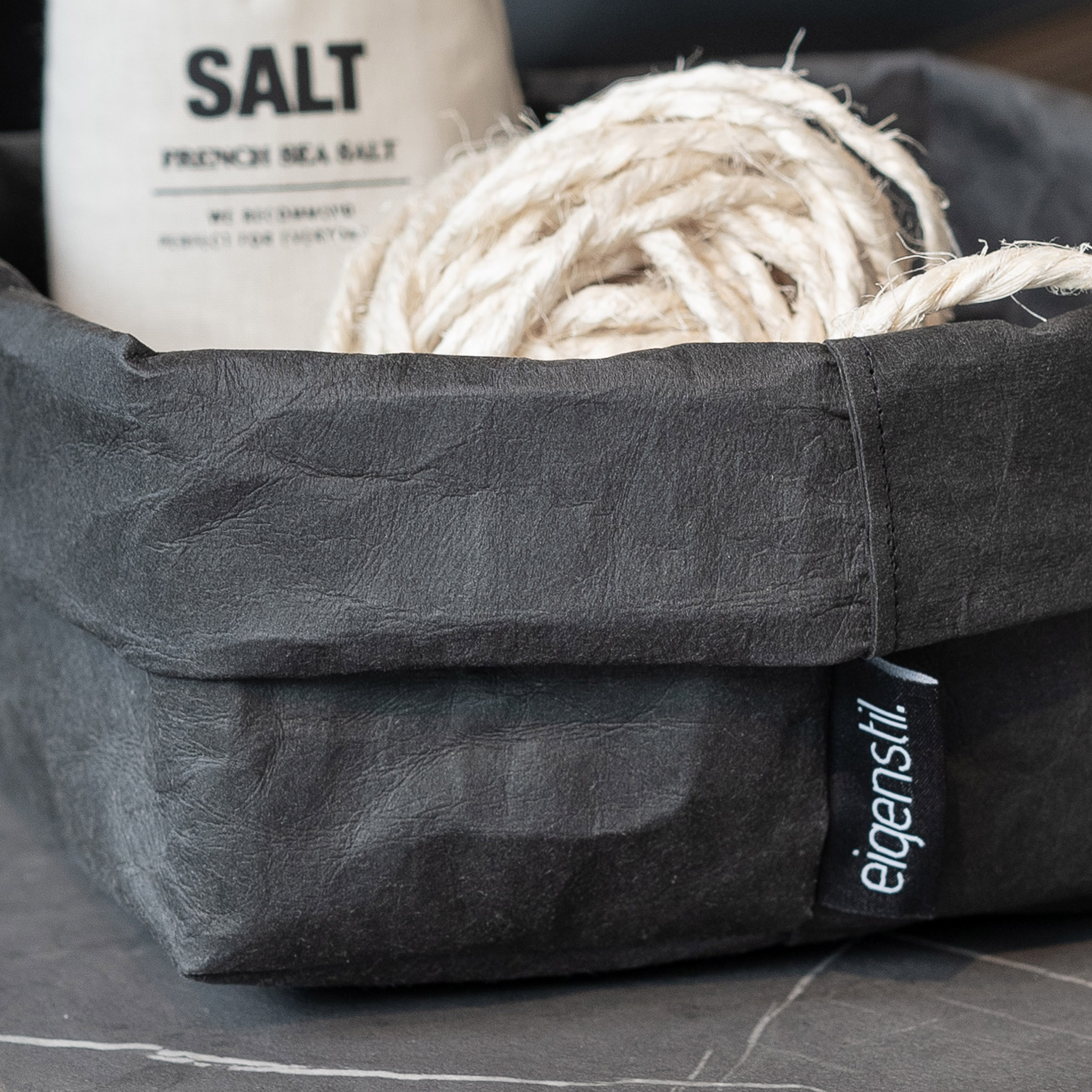 Der Brotkorb ist aus veganem Leder (Mischung aus Zellulose und Latex), es wird auch „washable paper“ genannt.