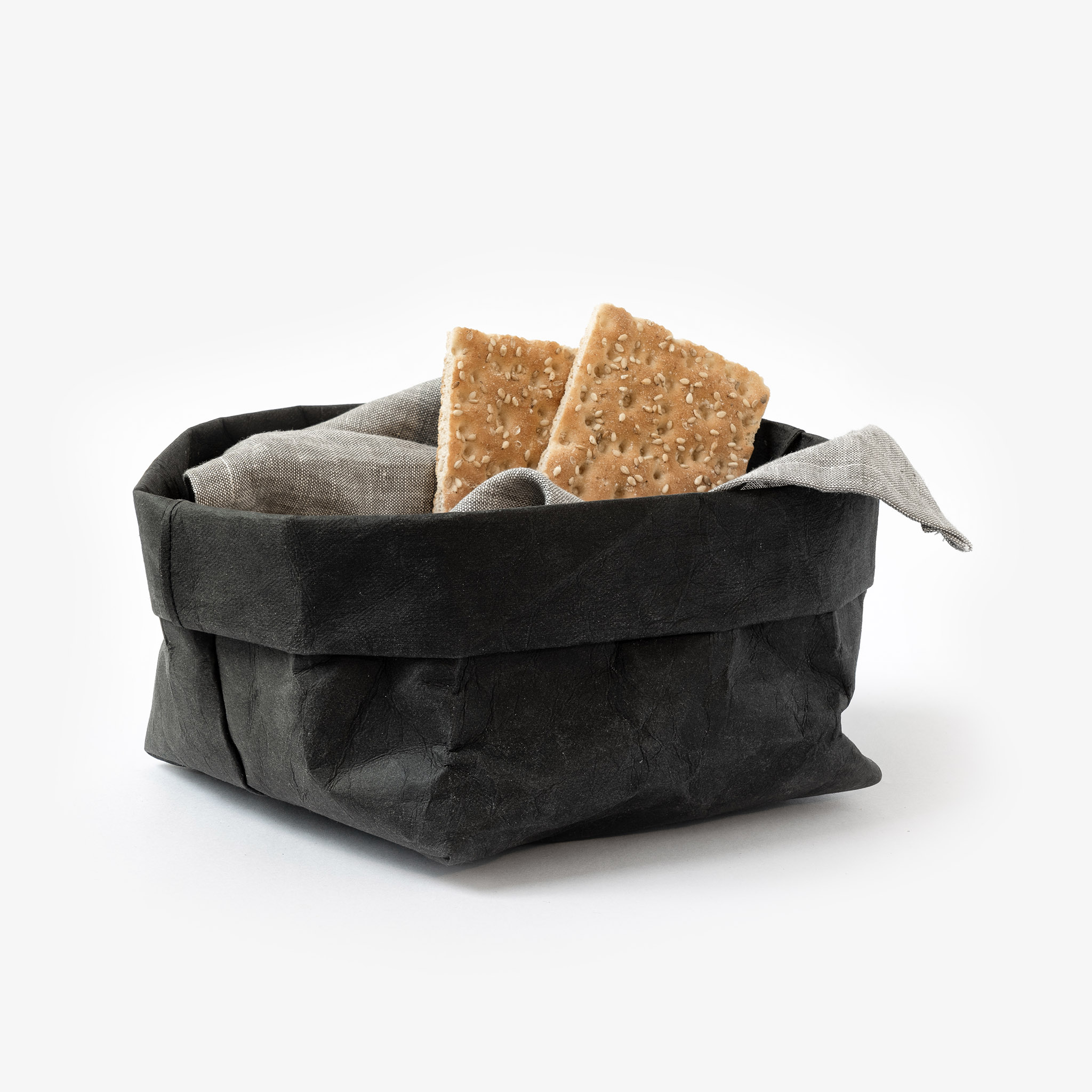 Der „knautschige“ Brotkorb ist auf jeden Esstisch ein Highlight und lässt sich ganz individuell mit Stoffservietten oder Leinentüchern kombinieren.